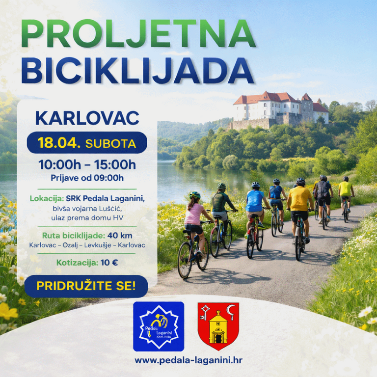 Sportsko rekreacijski klub "Pedala laganini" organizira u suradnji s Gradom Ozljem u subotu, 18. travnja 14. Proljetnu biciklijadu. Prijave za biciklijadu bit će istog dana ispred prostorija kluba, na ulazu u prostor bivše vojarne Luščić, preko puta Doma Oružanih snaga "Zrinski" s početkom u 9 sati. Start biciklijade predviđen je u 10 sati. Ruta biciklijade je kružna, dužine 40 km: Karlovac - Zadobarje - Jaškovo - Ozalj - Trg - Levkušje - Mahično – Karlovac. Startnina iznosi 10 eura, duži odmor, užina i druženje biciklista i domaćina bit će u Levkušju. Povratak u Karlovac očekuje se oko 15 sati. Mlađi od 14 godina obavezno s zaštitnom kacigom, u pratnji odrasle osobe.