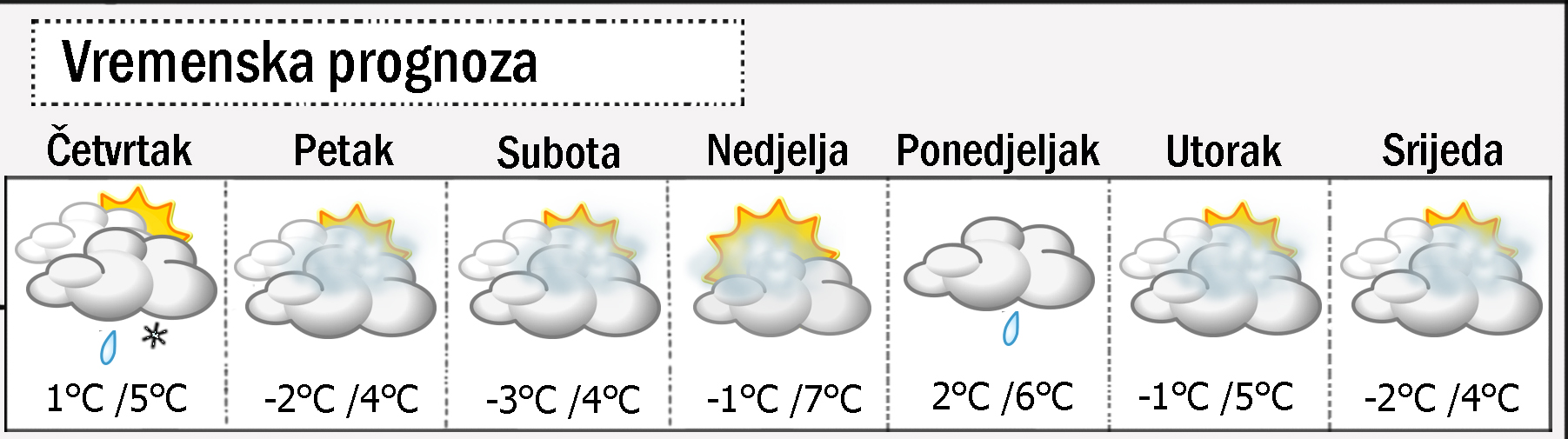 VREMENSKA PROGNOZA: Nešto malo slabih oborina još može biti i u četvrtak ujutro, uglavnom kiše, možda i susnježice. Tijekom dana prestanak oborina pa bi veći dio dana ipak trebalo biti suho, možda i uz malo sunca. Jutarnja temperatura blizu nule, a najviša dnevna mogla bi narasti do 5 Celzijevih stupnjeva uz umjeren sjeveroistočni vjetar.