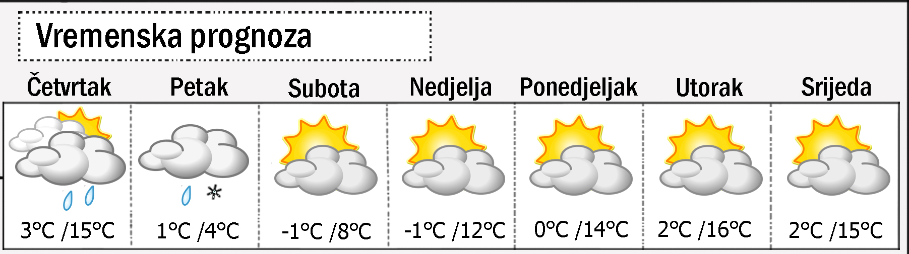 Za vikend prognostičke karte ukazuju na povoljnije vrijeme. Trebalo bi biti uglavnom suho i barem djelomično sunčano. To znači hladne noći i jutra jer će temperatura ići nekoliko stupnjeva ispod nule, osobito ako noći budu sasvim vedre. Danju će hladnoća postupno popuštati pa će temperatura polagano rasti, u nedjelju možda pređemo desetku.
